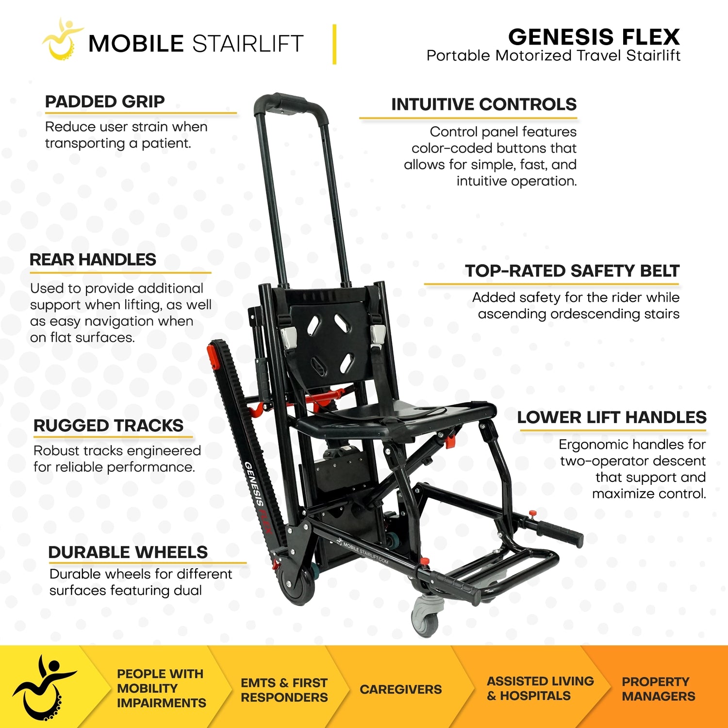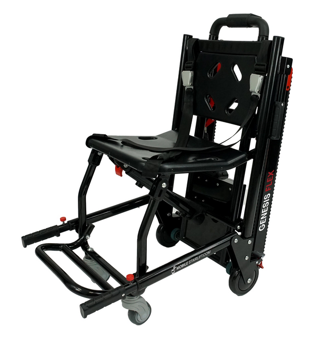 The Genesis Flex redefines what a portable stairlift can be. The first of its kind Portable Stair Chair brough to you by Mobile Stairlift combines the simplicity of a lightweight transport chair and battery-powered stairlift combined, giving you a versatile mobility option on and off the stairs. Designed for everyday life, the FLEX truly adapts to your lifestyle allowing you to leave your home making travel possible again. With a completely tool-free removable track, you can go from stair-climbing mode to transport chair mode in seconds, making it one of the most versatile accessibility devices on the market today.
